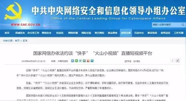 与此同时,国家网信办于4月4日依法约谈“快手”和今日头条旗下“火山小视频”相关负责人,提出严肃批评,责令全面进行整改。