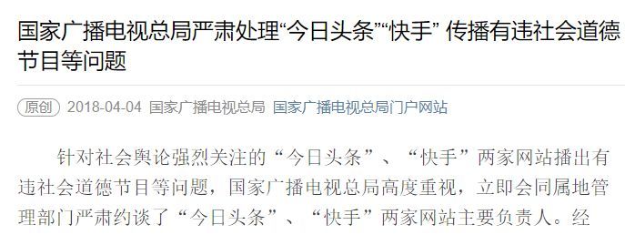 4月4日,国家广播电视总局官方微信号发布通知称,针对社会舆论强烈关注的“今日头条”、“快手”两家网站播出有违社会道德节目等问题,国家广播电视总局高度重视,立即会同属地管理部门严肃约谈了“今日头条”、“快手”两家网站主要负责人。