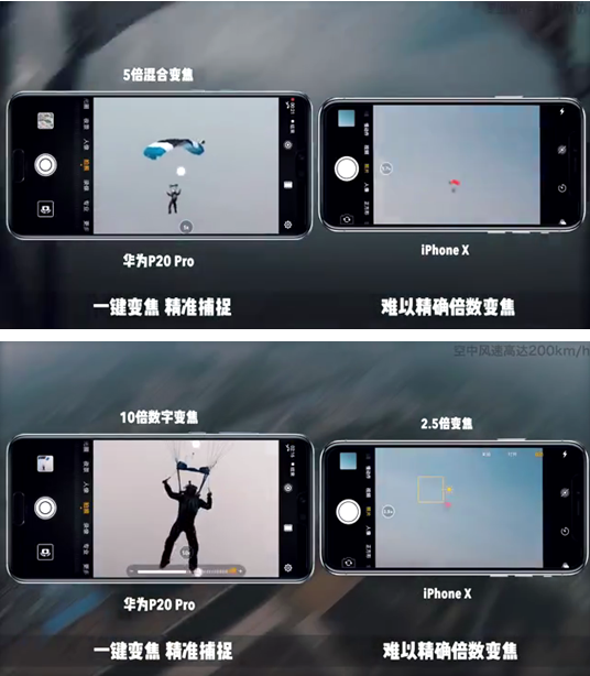 另外,可以看出在跳伞过程中,使用华为P20 Pro能够凭借一键快速变焦按钮瞬时完成特定倍率的变焦操作,对于极限环境中的应用来说不仅节省操作的时间成本,更可一定程度上规避因双手长时间操作而带来的安全隐患。