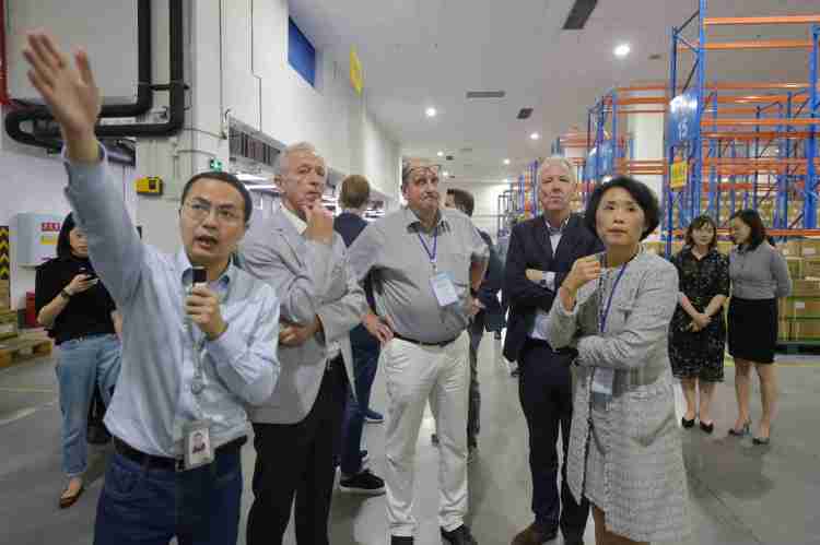 在永辉物流有限公司的常温配送中心,一条条现代化分拣线,以及一排排规范整齐的仓储货架,立即吸引了德国企业家们的注意。当了解到该仓库日均出入货峰值可达到42466箱,位居西南第一时,企业家们更是赞叹连连。