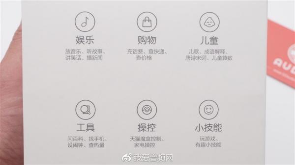包装盒物件一览:天猫精灵M1、电源适配器、使用说明书。