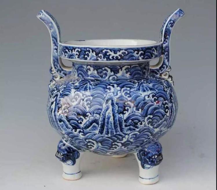 它与一般白地蓝花的青花器不同,是蓝地白花,即以青花为地,白釉表现海浪。浓重的青花发色、青料略有蕴散的缺陷美、仿青铜鼎的造型与满器似要外溢的海浪相融于一体,使青花炉具有憾人心魄的艺术魅力,令观者为之动容。完整的永乐青花寿山福海纹炉仅存一、二件,足以见其珍贵。