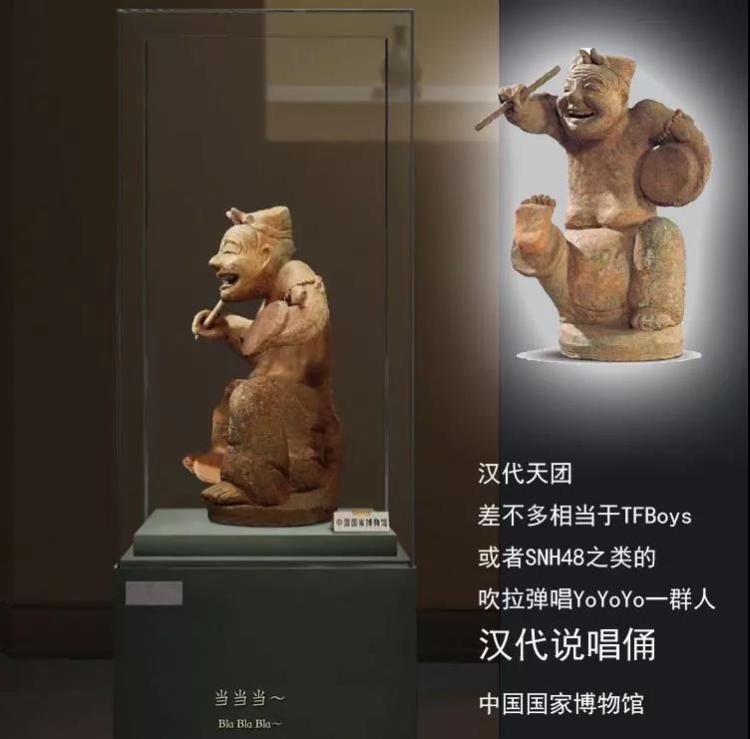 击鼓说唱俑是陪葬俑中少有的传神佳作。陶俑上戴帻,额前有花饰,袒胸露腹,着裤赤足,左臂环抱一扁鼓,右手举槌欲击,作击鼓说唱表演,神态诙谐,动作夸张,是一件富有浓厚民间气息和地方风貌的优秀雕塑作品。