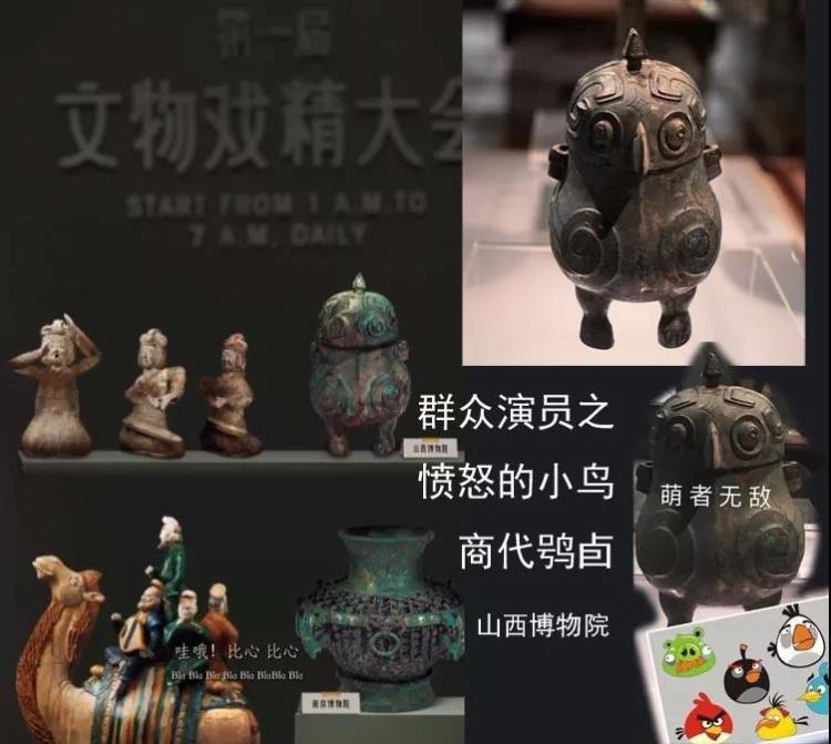鸮卣(xiāoyǒu)因为形似“愤怒的小鸟”而蹿红互联网,可以说是文物戏精里面的大。鸮是猫头鹰,卣是一种盛酒器。形如两鸮相背而立。盖为双鸮首,环目,尖喙,弯眉,盖中央置四阿顶方柱钮,饰雷纹。腹作双鸮身,子口微敛,垂鼓腹饰卷曲羽翼纹。身下为四爪,两两相背。盖腹相合,两鸮昂首背立。商代晚期青铜器精品。不仅实用,也是精美的艺术品。