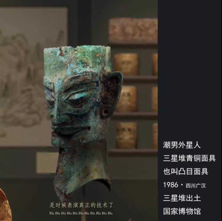 中国国家博物馆参赛的“戏精”是三星堆出土青铜面具。铜人头的面部方正,顶部平展,铸有子母口,以便戴冠。面部表情粗放,双眼圆睁,阔鼻,鼻梁突起,双唇紧闭。双耳垂穿孔,并以云雷纹为饰,脑后铸有长辫,发丝根根可见,颈部可接插木柄,其形象当与蜀人中的巫师有关。