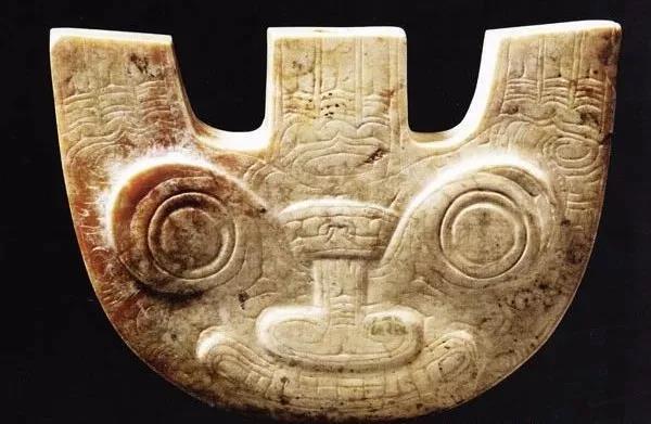 玉三叉形器是新石器良渚文化独创的玉器器形,是男性显贵者头部冠帽上特有的礼仪性装饰,其独特的造型,以及神人兽面图像的琢刻,充分显示出其别具一格的抽象化与象征性意义。