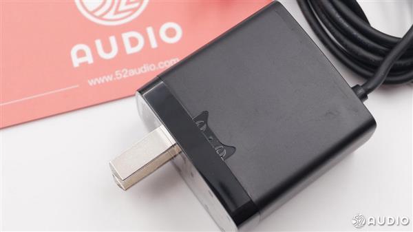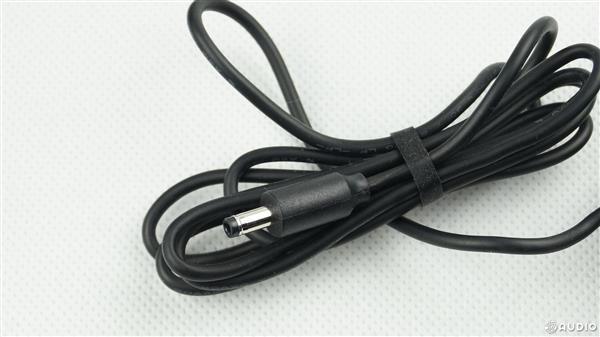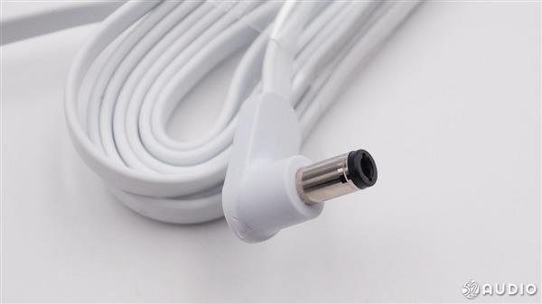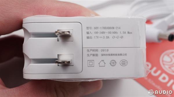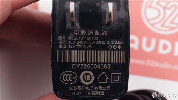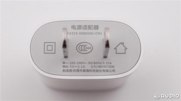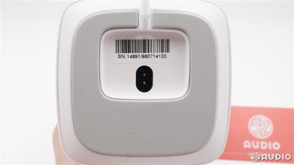 音箱底部带有一块灰色防滑橡胶垫,同时音箱的产品信息也印在橡胶垫上。中间的小洞洞里面是两个金属连接触头,用来与电源线相连接。