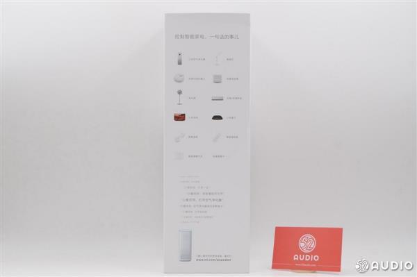 小米AI音箱包装背面印有小爱同学的主要功能,除了听音乐稳天气这种基础功能外,还包括查询道路状况、查找手机、中英翻译等,并且还在持续更新。