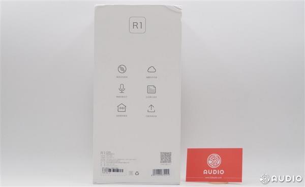 包装背面印有这款产品的几个主要功能点,分别是极听视觉享受、海量有声内容、智能语音交互、生活得力助手、语音操控家居、功能持续升级,下面是R1的产品信息。