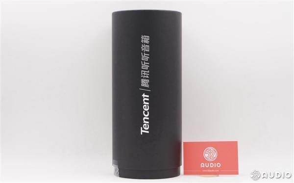 腾讯听听音箱的包装整体采用黑色圆柱体设计,前面是腾讯的英文Logo以及采用了腾讯字体的腾讯听听音箱中文字样。