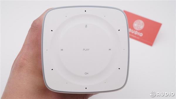 音箱顶部采用四麦克风阵列拾音,中间是多功能按键,单机可下达语音指令,双击进入休眠,连按三下开启蓝牙连接。按键周围部分可以进行触摸操作,通过手指滑动圆环区域,可以调节音量大小。