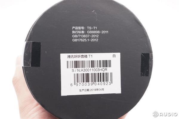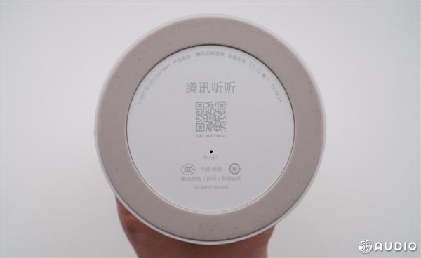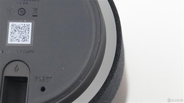 音箱底部是产品信息,四周带有一圈橡胶防滑垫,品质上放在桌面上还是比较稳定可靠的。仔细看,上面的小字中标明产品的标准名称为腾讯听听音箱,设备型号为TS-T1。中间有一个非常小的RESET孔,也就是常说的复位按键。