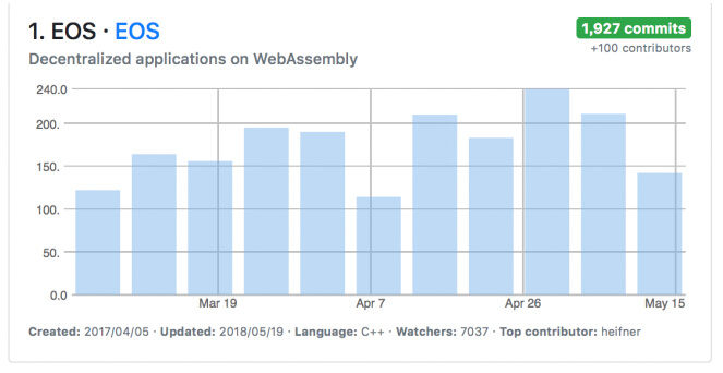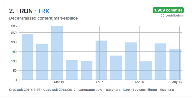 从上图可以看出,TRON 项目提交代码的活跃度位列全球第二,仅次于EOS。