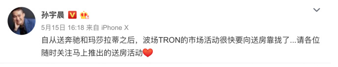 近期,孙宇晨的微博更新非常频繁,不断为TRON 主网上线发声,而最近的一则微博却让人不禁感叹,TRON 对市场营销可谓是非常非常重视了。