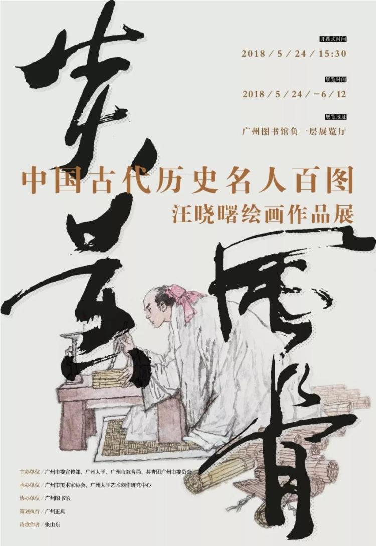 2018年5月24日15:30,由广州市委宣传部、广州大学、广州市教育局、共青团广州市委员会联合主办的“炎黄风骨——中国古代历史名人百图汪晓曙绘画作品展”,于广州图书馆负一层展览厅隆重开幕。