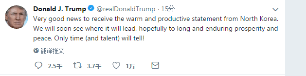 特朗普当天在个人推特上写道:“很高兴收到来自朝鲜的暖心且富有成效的声明。我们很快就会看到未来(事态)将走向何方,希望能取得持久的繁荣与和平。只有时间会告诉你答案!”