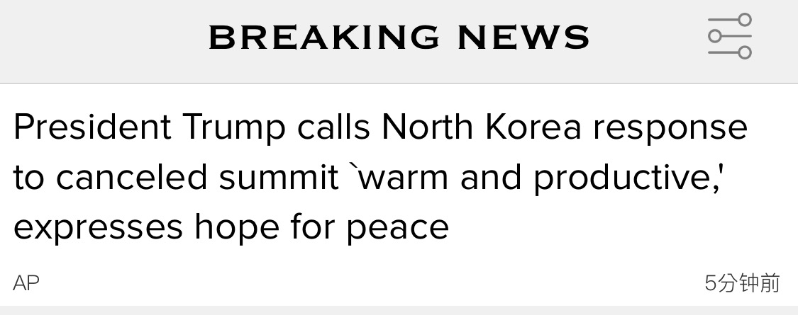 【环球网综合报道 记者 张骜 丁洁芸】据美联社5月25日报道,美国总统特朗普当天表示,朝鲜对于(美朝)会晤取消一事的反应“暖心且富有成效”,他还表达了对于和平的期盼。