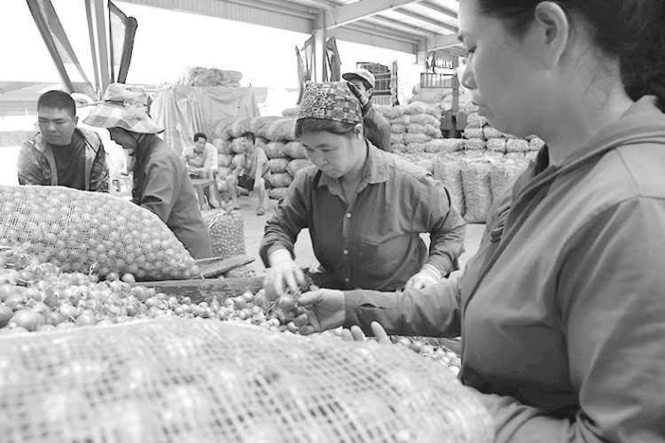 凭祥边境贸易货物监管中心,越南女工挑拣中国出口至越南的大蒜。陈青青摄