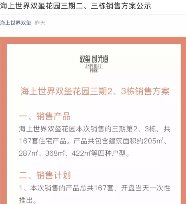 5月26日,深圳海上世界双玺楼盘项目发布《海上世界双玺花园三期二、三栋销售方案公示》,本次销售的产品共167套,开盘当天一次性推出。产品中包含建筑面积约205平方米、287平方米、368平方米、422平方米等四种户型。