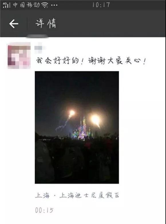到了4月3日,小叶妈妈看到女儿更新了朋友圈:我会好好的,谢谢大家关心!这条朋友圈的坐标是在上海迪士尼乐园。