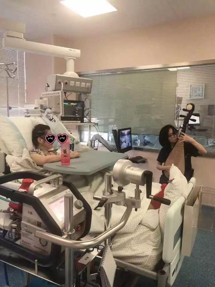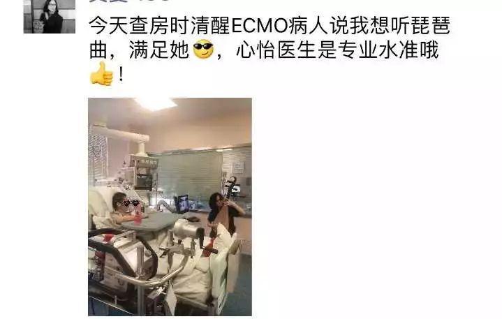 ICU主任黄曼在一旁拿出手机,记录下了这个时刻,并发在了朋友圈,“今天查房时清醒的ECMO(人工心肺)病人说想听琵琶曲,满足她,心怡是专业水准哦!”
