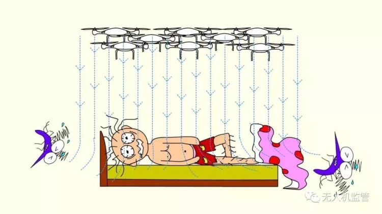 直接使用多架无人机悬停在床的上方,让风力直接覆盖整个床,产生的风力同样可以让蚊子无法靠近。