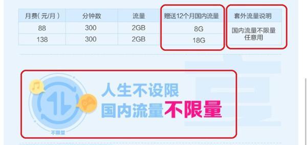 中国移动某地的“任我用”88元全国不限量套餐说明则更复杂,分布于不同界面。详情页显示,套餐内流量只有2G、另外赠送12个月8G国内流量,套外流量却强调“国内流量不限量任意用”。