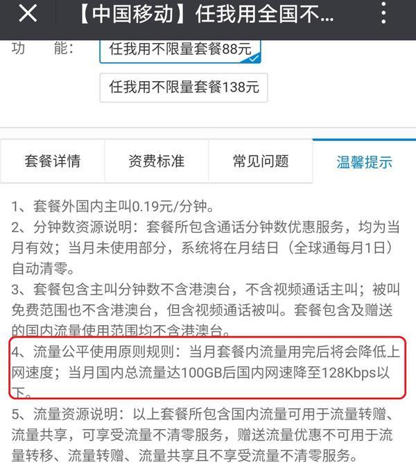 至于总使用流量达到100G后的降速规定,则在温馨提示界面才能找到——网速会降至128Kbps以下。