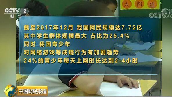 数据显示,截至2017年12月,我国网民规模达7.72亿,其中学生群体规模最大,占比为25.4%。同时,我国青少年对网络游戏等成瘾行为有加剧趋势,24%的青少年每天上网时长达到2-4小时。