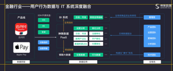 这家金融企业的产品运营和营销团队会使用神策分析的可视化分析界面指导决策,BI系统从神策分析系统调用指标,呈现给高层可视化的报表;同时大数据平台也会获得完整的用户行为数据,进行风控反作弊等方面的工作,这是金融行业里面很多客户都在深度尝试的场景。