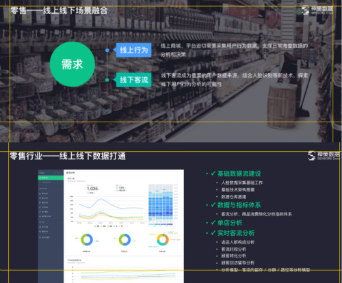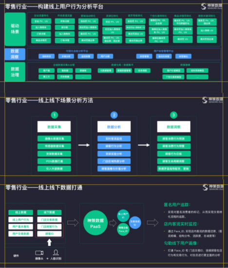 神策数据服务于很多零售标杆企业,这个过程中神策数据也发现了零售行业的数据特点,零售行业的用户行为分为两部分,线上行为,包括使用APP、小程序、公众号等;线下行为,如门店浏览货架的数据等。针对线上线下数据打通的难题,神策数据为零售行业提供了数据采集方案。