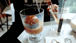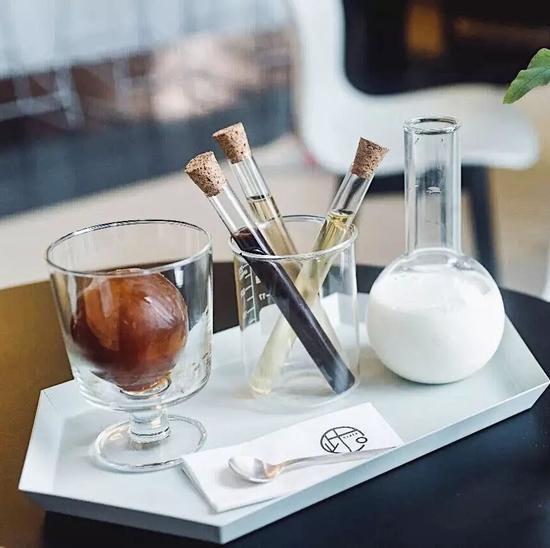 大大小小的玻璃器皿让人仿佛置身实验室,一个咖啡冰球,3管神奇药水,一杯牛奶,是时候表演真正的技术了!
