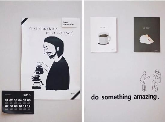 墙壁上贴了很多标语和海报,吸引我的是日本静冈的 IFNi 咖啡海报和正在制作手冲咖啡的咖啡师、咖啡插画,一切都是咖啡世界里的元素,每一份都是经典。