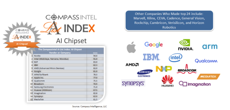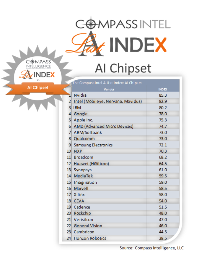 近日,市场研究公司Compass Intelligence发布了最新研究报告,在全球前15大AI芯片企业排名表中,前三名是英伟达(Nvidia)、英特尔(Intel)以及IBM,华为位列第12名,成为TOP15的中国“独苗”。