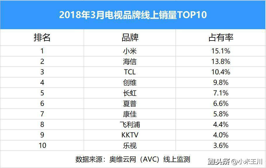 奥维云网(AVC)最新发布的《全球TV品牌出货月度数据报告》显示,2018年3月,小米电视国内出货55万台,位居中国第二。