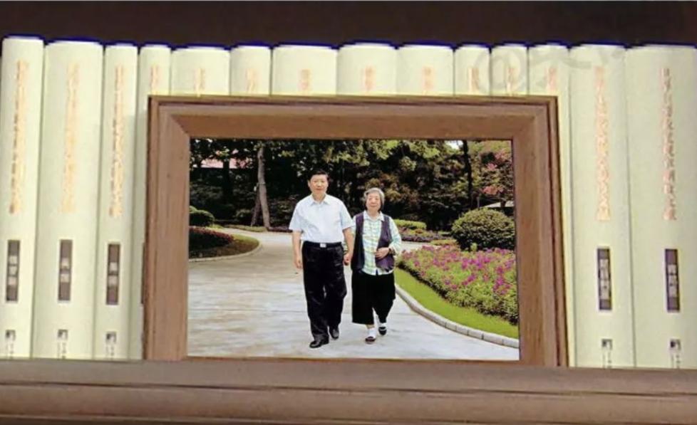 在习近平总书记的书架上,摆着这样一张照片。记录下了习近平陪伴母亲散步的温馨时刻,习近平拉着母亲齐心的手,漫步在公园中。