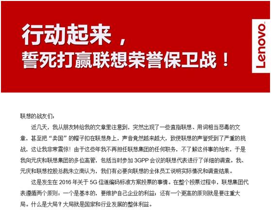 近几天,我从朋友转给我的文章里注意到,突然出现了一些直指联想、用词相当恶毒的文章,甚至把“卖国”的帽子扣在联想身上,声音竟然越来越大,致使联想的声誉受到了严重的挑战,这让我非常震惊!由于这些年我不再担任联想集团的任何职务,不了解这件事的始末,于是我向元庆和联想集团的多位高管,包括当时参加3GPP会议的联想代表进行了详细的调查。我、元庆和联想控股总裁朱立南认为,我们有必要向联想的全体员工说明实际情况和调查结果。