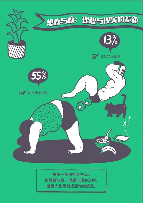 数据显示,超过一半的“想瘦一族”,但只有13%的最后成功实现瘦身,这也许和“想瘦一族”缺乏明确的动机,只是单纯想瘦的这种心理也不无关系。社会包容“不瘦”,所以也没有必要对自己太过苛刻。