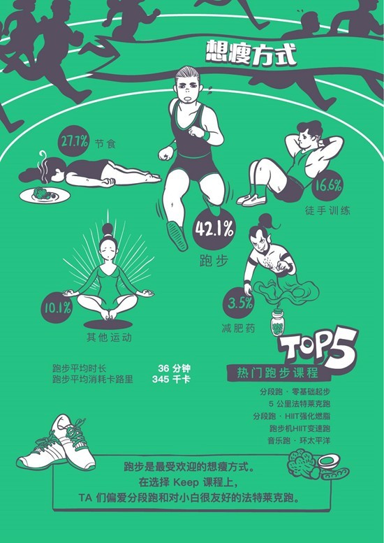 在选择运动方式上,跑步成为了“想瘦一族”的最爱。而在选择课程上,“想瘦一族”会更钟意Keep上的分段跑课程和对小白跑者很友好的法特莱克跑。