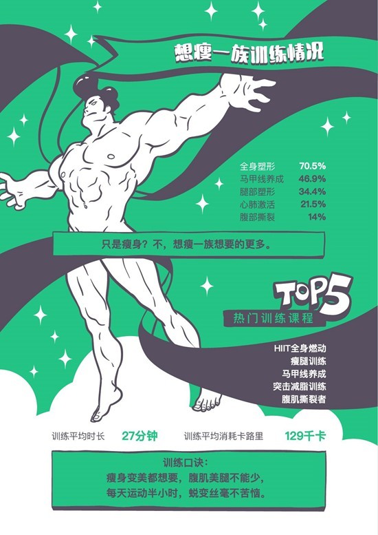 如果你认为“想瘦一族”们只是想瘦,那就大错特错了。70% 的人想要全身塑形,近一半人羡慕马甲线,1/3 的人想拥有完美的腿型。而在 Keep 上,“HIIT全身燃动、瘦腿训练、马甲线养成、突击减脂训练、腹肌撕裂者”荣登热门课程Top5。
