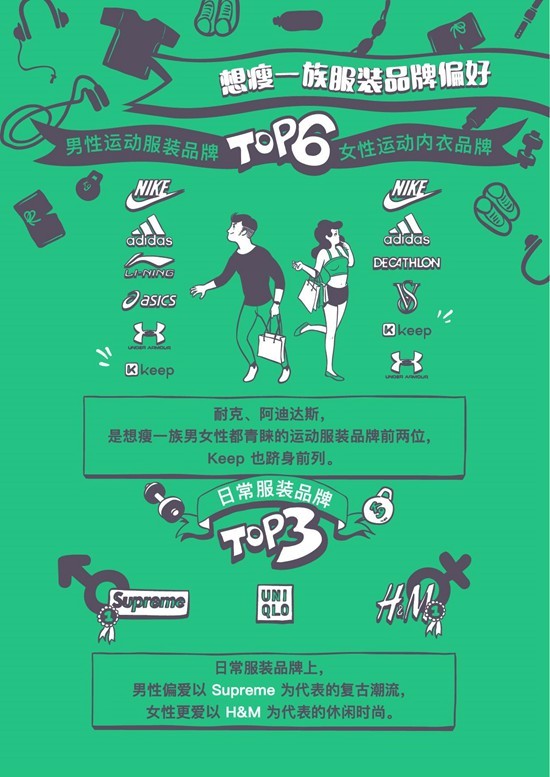 在运动品牌和日常服装的选择上,“想瘦一族”也有明确的指向性。特别是在日常服装上,男性偏爱以Supreme为代表的复古潮流,而女性则更爱以HM为代表的休闲时尚。