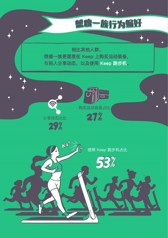 另一项数据显示,相比其他人群,“想瘦一族”更愿意在Keep App里分享动态、晒出自己的瘦身成功经验;购买运动装备、来帮助更好运动瘦身。同时TA们也是Keep跑步机的忠实拥趸,超过53%的Keep跑步机用户是“想瘦一族”。
