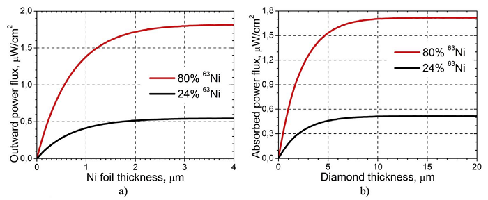 【研究配图:a 为放射性镍箔与材料厚度的关系,b 为钻石换能器的电子吸收效率和厚度的关系(via:MIPT)】