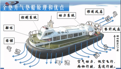 如此应用广泛的气垫船,很多人好奇它的原理是什么?气垫船是利用高压空气在船底和水面(或地面)间形成气垫,使船体全部或部分升起,减小船体航行时的阻力,实现高速航行。由于气垫船不依靠水的浮力支撑船体,所以它除了可以在水面航行,还可以在野外、沼泽地、湿地以及陆地等各种平面行驶,是水陆两栖的高性能船舶。