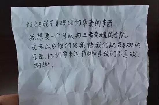 “叔叔我不喜欢你们带来的东西,我想要一个可以打王者荣耀的手机。或者以后你们给我钱,我们自己买喜欢的东西,你们带来的书和文具,我们不喜欢,谢谢。”