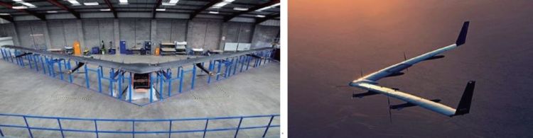 美国Google公司和Facebook公司均通过收购公司项目的形式,投入巨资开展了空基互联网应用研究和技术验证,目前两家公司均已开展了样机飞行。其中,Google公司除了被公众熟知的利用高空气球实现互联网信号接入的“潜鸟计划”(Project Loon,也称“热气球网络计划”)外,为实现更大的通信速率和更加灵活的使用模式,发展了“索拉拉”(Solara)系列太阳能无人机,采用大展弦比正常式布局,翼展50 m,有效载荷32 kg,2015年5月1日,Solara50(图1)在美国新墨西哥州进行了试飞。