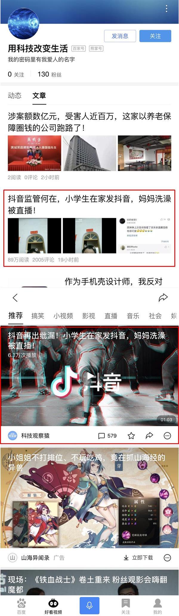 近日,一段名为《小学生在家发抖音妈妈洗澡被直播》的视频在网上大范围传播,对此抖音表示是有人恶意推动。经查证,该视频是用户于6月19日22:06发布,视频远处背景有意外走光内容,23:46视频被下线,播放量216次。并非直播内容。抖音强调,时隔两天后,这条短视频在网络上突然被大规模传播,明显有人恶意推动。仅在手机百度上,视频的播放量就高达89万次。