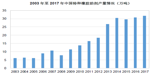 十余年来,轮胎工业的快速发展也带来国内特种橡胶助剂行业快速发展。我国特种橡胶助剂产量由2003 年的6.03 万吨增长至2017 年年的31.70 万吨,年复合增长率为12.59%,国内特种橡胶助剂市场已经完成从主要依赖国外进口到大部分产品国产化的转变过程。