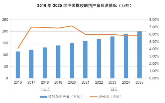 根据《中国橡胶工业强国发展战略研究》,到“十三五”末(2020年),我国橡胶助剂行业总产量将达到150万吨,平均年增长率达到7%,预计实现总销售收入不低于250亿元,全行业销售额保持年增长6%以上;到“十四五”末(2025年),我国橡胶助剂行业总产量将达到200万吨,平均年增长率达到6%,行业总销售收入不低于300亿元。橡胶助剂行业未来仍将保持稳定增长的态势。