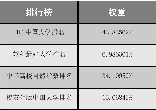 《中国高校的进步与退步排行榜》共收录了731所高校在THE中国大学排名、软科最好大学排名、中国高校自然指数排名、校友会版中国大学排名上的排名及得分,对比其在排行榜上的增长(降幅)指标,并根据这4项排名的官方网站的被引用数,综合高校社会舆论影响力、高校调研等,定义4项排名的权重如下: